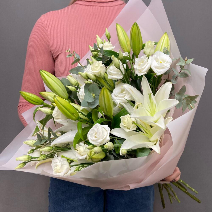 На фото букет «чистое сияние». В составе: лилия 3 шт, эустома (лизиантус) 4 шт, эвкалипт 3 шт, дизайнерская упаковка 1 шт, атласная лента 1 шт, . Все цветы свежие и ароматные, букет красиво оформлен и отлично подходит для подарка. Доступна доставка цветов или самовывоз.